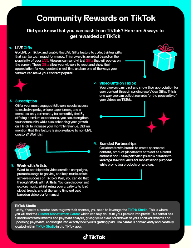 TikTok is committed to equipping creators with the best tools to transform their passions into sustainable income. To explore these features and see which ones you qualify for, simply: