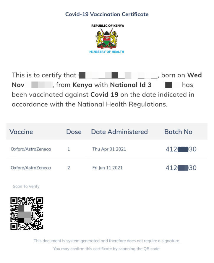 The COVID-19 Vaccination Certificate in Kenya should look something like this: