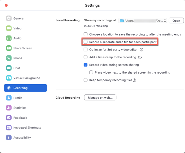 When recording locally, the host can record all participants’ audio streams as separate audio files, one file for each participant. To enable this option: