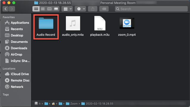 Note: By default, the audio/video file (MP4) will be named Zoom_0.mp4. The audio only file (M4A) is named audio_only.m4a.