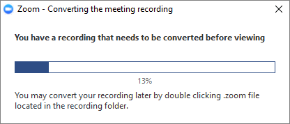 Note: Dial-in participants will hear a message informing them that the meeting is now being recorded unless disabled by the host. - After the meeting has ended, Zoom will convert the recording so you can access the files.